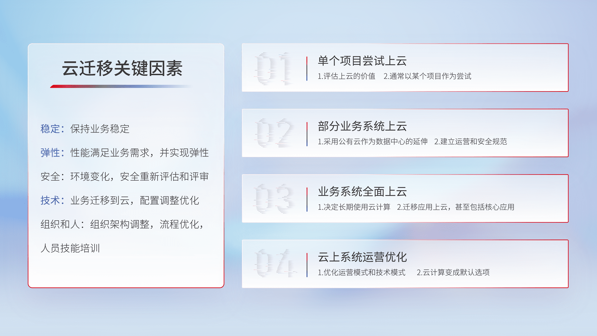 结合实际业务,,从规划设计、、云平台选型、、云原生改造、、、数据迁移、、集成交付,,,迁移全过程为客户识别最佳上云路径,,做好风险识别管理,,,设计网络架构、、身份权限、、安全审计合规、、操作审计、、日志审计、、、监控告警策略、、、多站点容灾设计等,,对云上基础设施进行整体规划,,,提升IT治理水平,,以满足弹性、、高可用、、、、高性能的需求。。