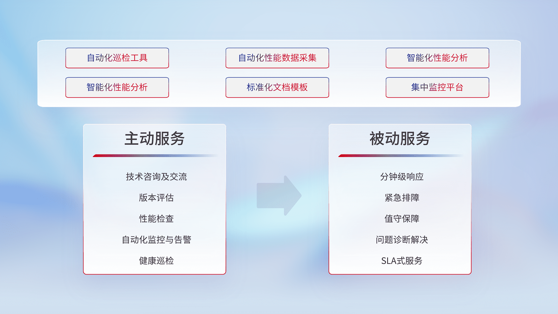 智能化工具和标准化文档,,,保障服务质量,,,提供主动服务(包含技术咨询、、、、版本评估、、、、性能检查、、、、自动化监控与告警、、健康巡检)和被动服务包含(分钟级响应、、紧急排障、、、、值守保障、、、、问题诊断解决、、、、SLA服务)。。。