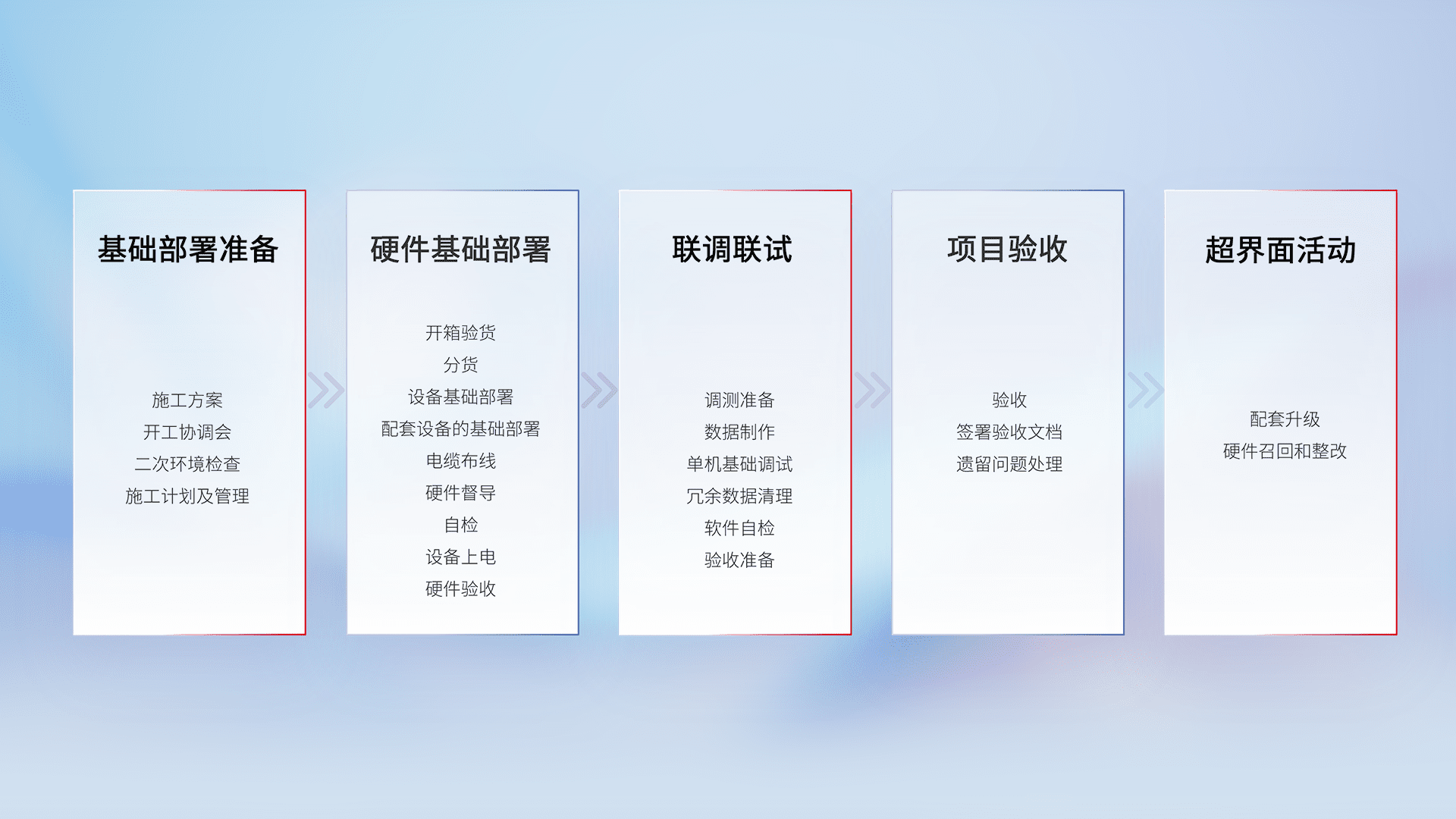 从基础部署准备、、、、硬件基础部署、、、联调联试、、、项目验收、、、、越界面活动的全过程可追溯,,,保证施工质量和进度。。。。